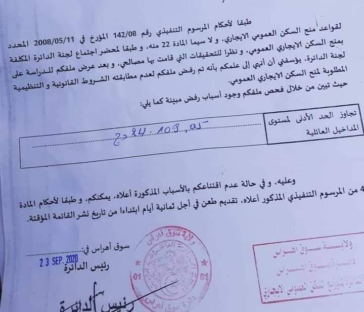 الموظف البسيط ممنوع من السكن الإجتماعي بحجة أن راتبه تجاوز 2.4 مليون سنتيم.سؤال لمن وضع هذا القانون المجحف : هل الموظف الذي راتبه مثلا 2.8 مليون سنتيم أو نقول 3 مليون أو حتى 4 مليون سنتيم ويكون رب أسرة يستطيع : بناء مسكن أو شراء مسكن أو إيجار مسكن ❗♦ راتب شهري لا يكفي حتى للأكل أليست عبودية مقننة ؟هل سنرى في القريب العاجل مراجعة لهذا القانون المجحف في حق من يتقاضون راتبا أكثر من 24 الف دينار ولا يتجاوز 40 الف دينار؟