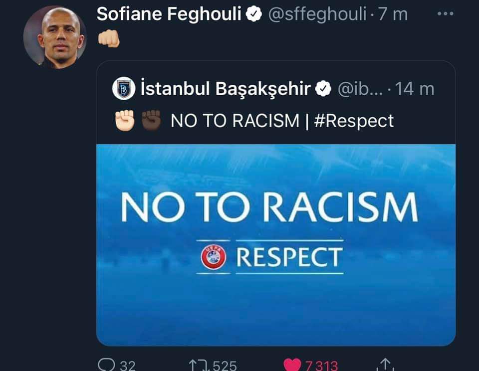 الدولي الجزائري سفيان فيغولي يتعاطف مع فريق اسطنبول باشاك شهير الذي انسحب من مواجهة باريس سان جيرمان في منافسة رابطة أبطال أوروبا بعد لفظ عنصري من الحكم الرابع اتجاه مساعد المدرب أشيل ويبو