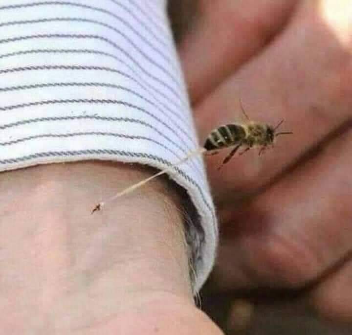 نرى في الصورة نحلة تلسع يد أحد الأشخاص ثم تحاول الفرار بينما تبقى الإبرة ملتصقة بيد الضحية …